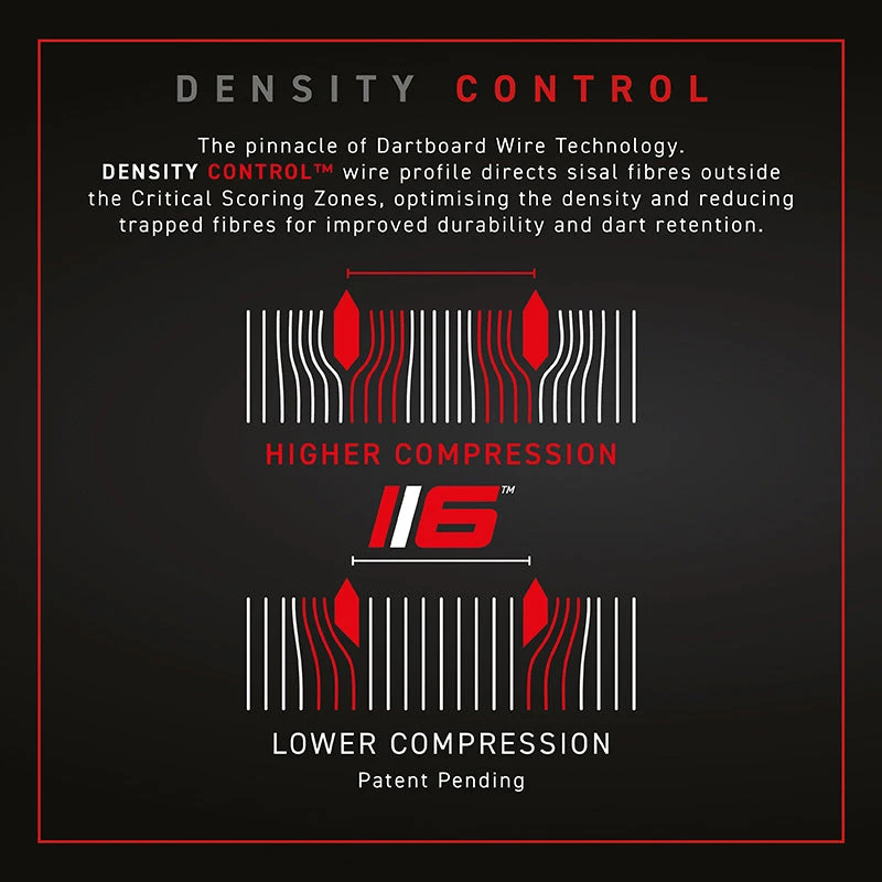 The ultra-thin 60° angled wire deflects darts into the scoring area for absolute minimal bounce outs.The fully hardened bullseye and outer bull, both featuring ‘Density Control™’ wire, are now 25% thinner.
